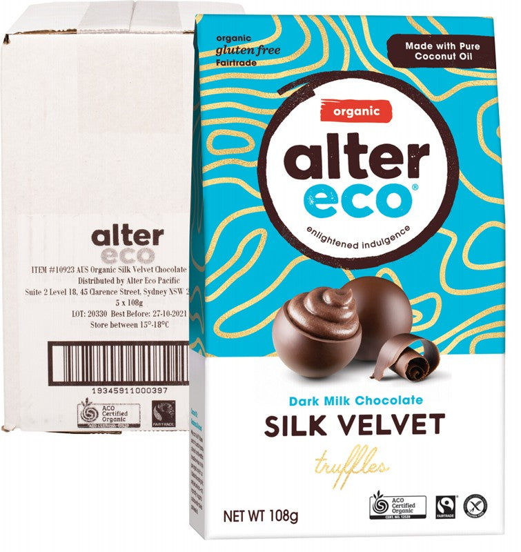 ALTER ECO Chocolate (Organic) Dark Milk Silk Velvet Truffles - 5x108g *Organic Raw Cane Sugar, *Organic Cocoa Butter, Organic Whole Milk, *Organic Coconut Oil, *Organic Cacao Beans, Natural Flavours, *Organic Vanilla Beans. *Traded in Compliance with Fairtrade Standards, Total 81%.