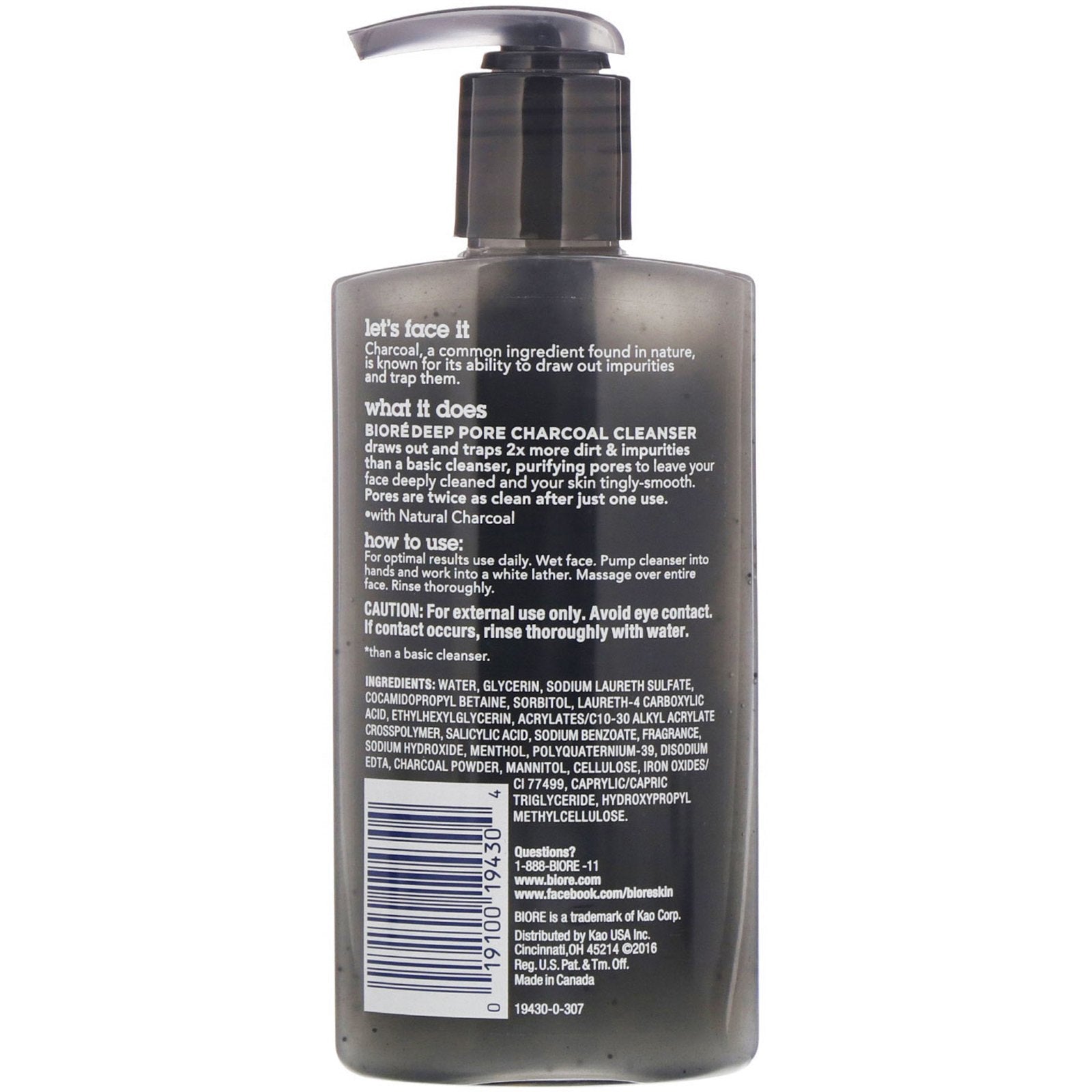 Biore Deep Pore Charcoal Cleanser draws out and traps 2x more dirt & impurities than a basic cleanser, purifying pores to leave your face deeply cleaned and your skin tingly-smooth. Pores are twice as clean after just one use.