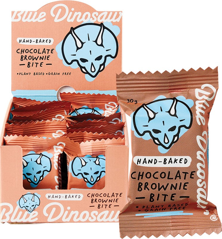 BLUE DINOSAUR Hand-Baked Bite Chocolate Brownie - 18x30g Organic Coconut, Dates, Organic Cacao Butter (8.6%), Organic Raw Cacao (8.6%), Pink Himalayan Rock Salt.
