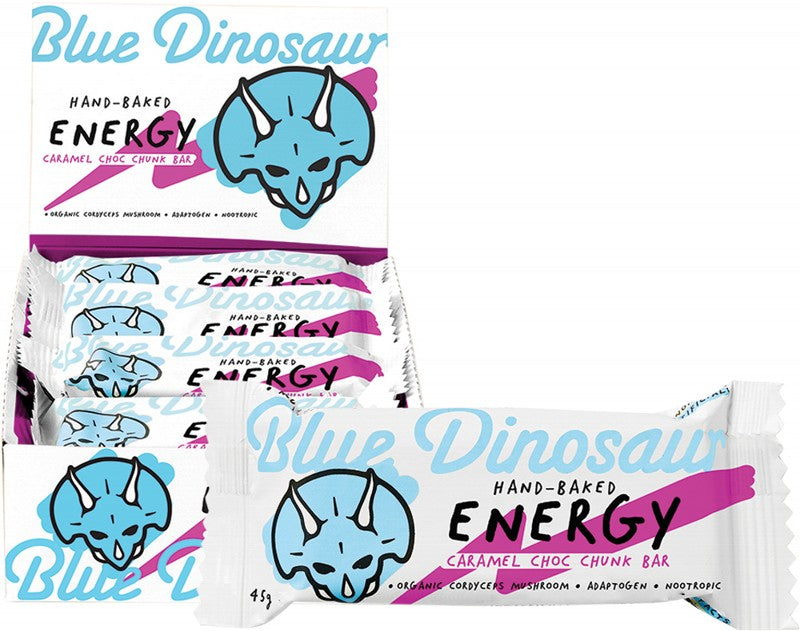 BLUE DINOSAUR Hand-Baked Energy Bar Caramel Choc Chunk - 12x45g Dates, Almond Butter (From 100% Almonds), Organic Coconut, Organic Caramel Chocolate (Virgin Cacao Butter, Evaporated Coconut Nectar, Raw Cashew Nuts, Coconut, Hazelnuts Almonds) (9.5%), Organic Cacao Butter (9.5%), Organic Cordyceps Militaris Mushroom Powder (4.5%), Pink Himalayan Rock Salt.