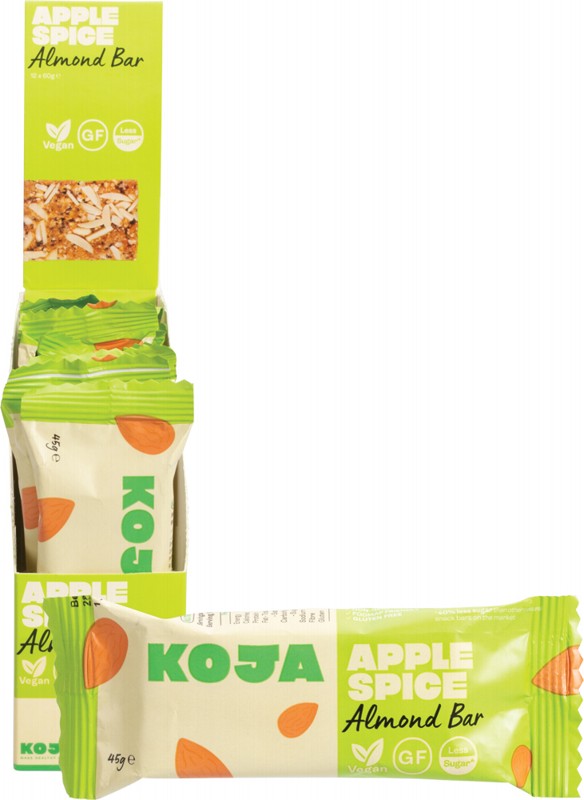 KOJA Almond Bar Apple Spice - 12x45g Organic Rice Malt Syrup, Desiccated Coconut, Rice Puffs, Almonds (12%) (Almond Butter, Almond Meal, Slivered Almonds), Organic Coconut Oil, Pumpkin Seeds, Organic Coconut Sugar, Chia Seeds, Freeze Dried Apple (<0.5%), Spice (<0.5%) (Cinnamon, Cardamon), Himalayan Salt.
