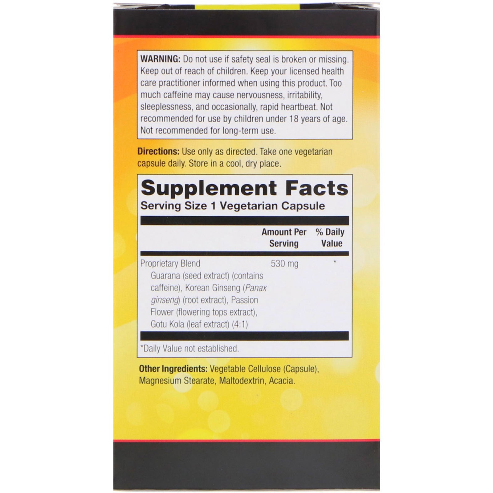 Guarana (seed extract) (contains caffeine), Korean Ginseng (Panax ginseng) (root extract), Passion Flower (flowering tops extract), Gotu Kola (leaf extract) (4:1)