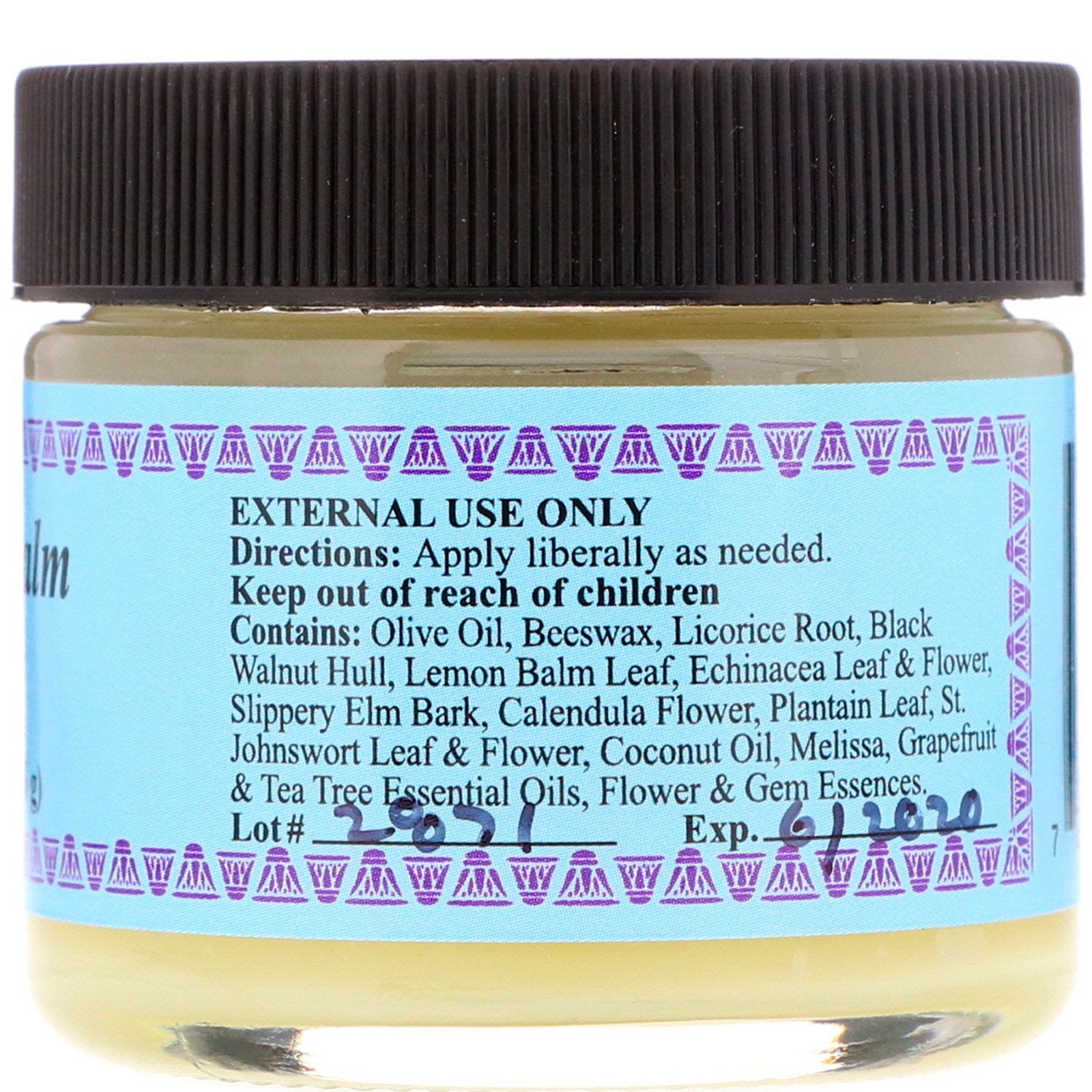 Olive oil, beeswax, licorice root, black walnut hull, lemon balm leaf, echinacea leaf & flower, slippery elm bark, calendula flower, plantain leaf, st. johnswort leaf & flower, coconut oil, melissa, grapefruit & tea tree essential oils, flower & gem essences.